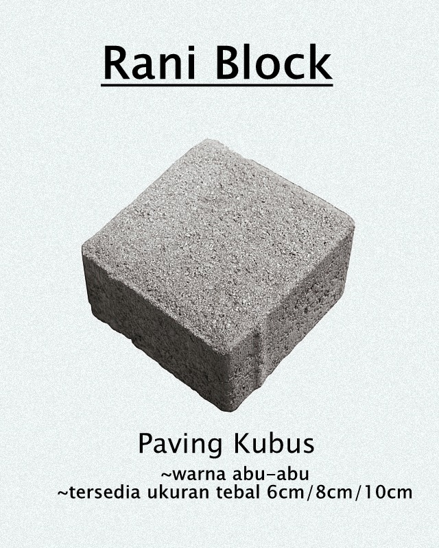 Salah satu model paving block adalah paving block Kubus. Tersedia dengan berbagai warna dan ukuran ketebalan. Disain pemasangan paving block perlu ditentukan sebelum pemasangan. Dan pemilihan ketebalan paving block ditentukan berdasarkan kebutuhan pemakaiannya.